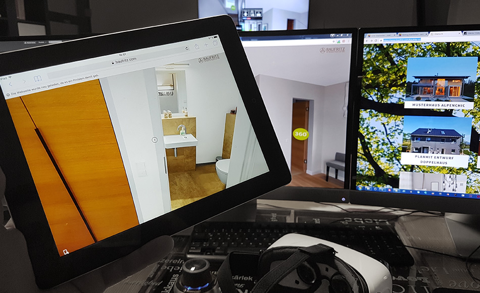 Für das Bauunternehmen Baufritz realisierten wir eine Virtual-Reality Ansicht, die die Vorstellungskraft der Interessenten auf einzigartige Weise beflügelt. Mit einer preiswerten VR-Brille (Cardboards) können die Musterhäuser in fotorealistischer Umgebung besichtigt werden. So entsteht weit vor der Fertigstellung ein räumliches Verständnis für das Objekt. Darüber hinaus ist die Applikation mit mobilen Geräten kompatibel und auf der Website aufrufbar.